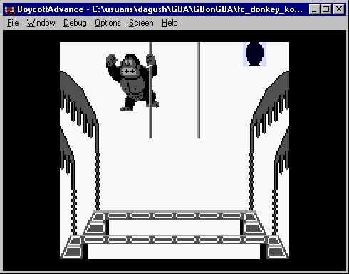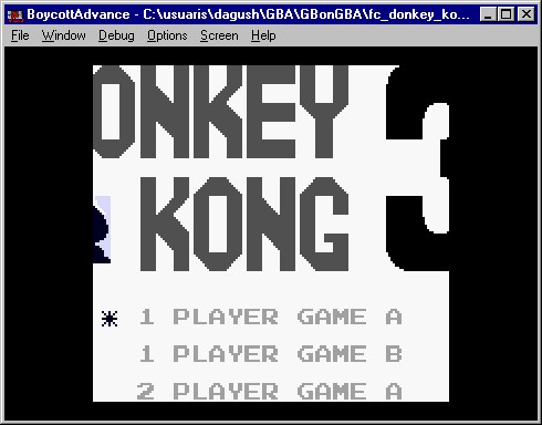 Emulador: NES4GB, ejecutándose en el GBonGBA para GBA, ejecutándose en el BoycottAdvance para Windows. Recordar que GBonGBA es un emulador de GB, no GBC. |