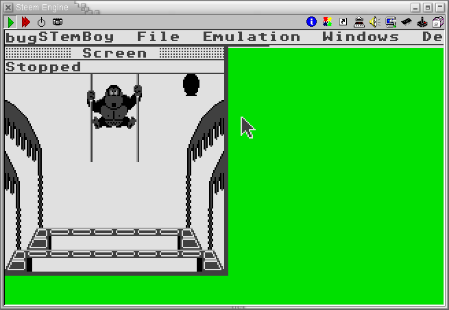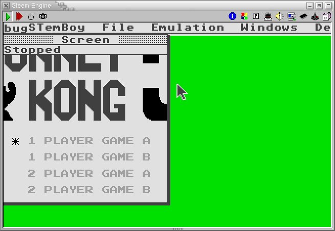 Emulador: NES4GB, ejecutándose en el STemBoy para AtariST, ejecutándose en el Steem para Linux. Recordar que STemBoy es un emulador de GB, no GBC. |