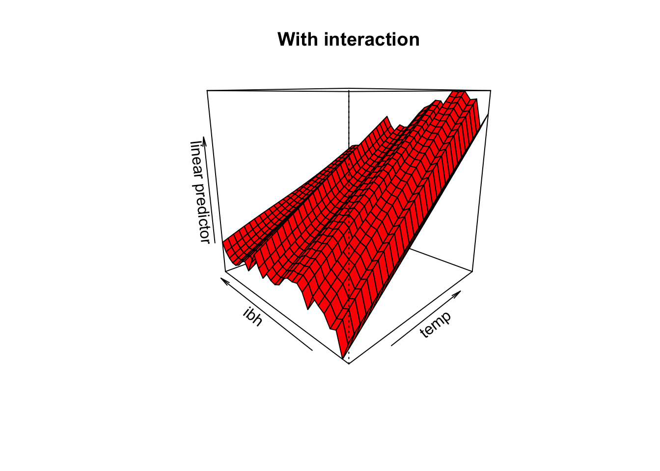 and note that the adjusted \(R^2\) has hardly changed from the model without the interaction term. It is easy to visualise the predictions from the model with interaction using vis.gam.
