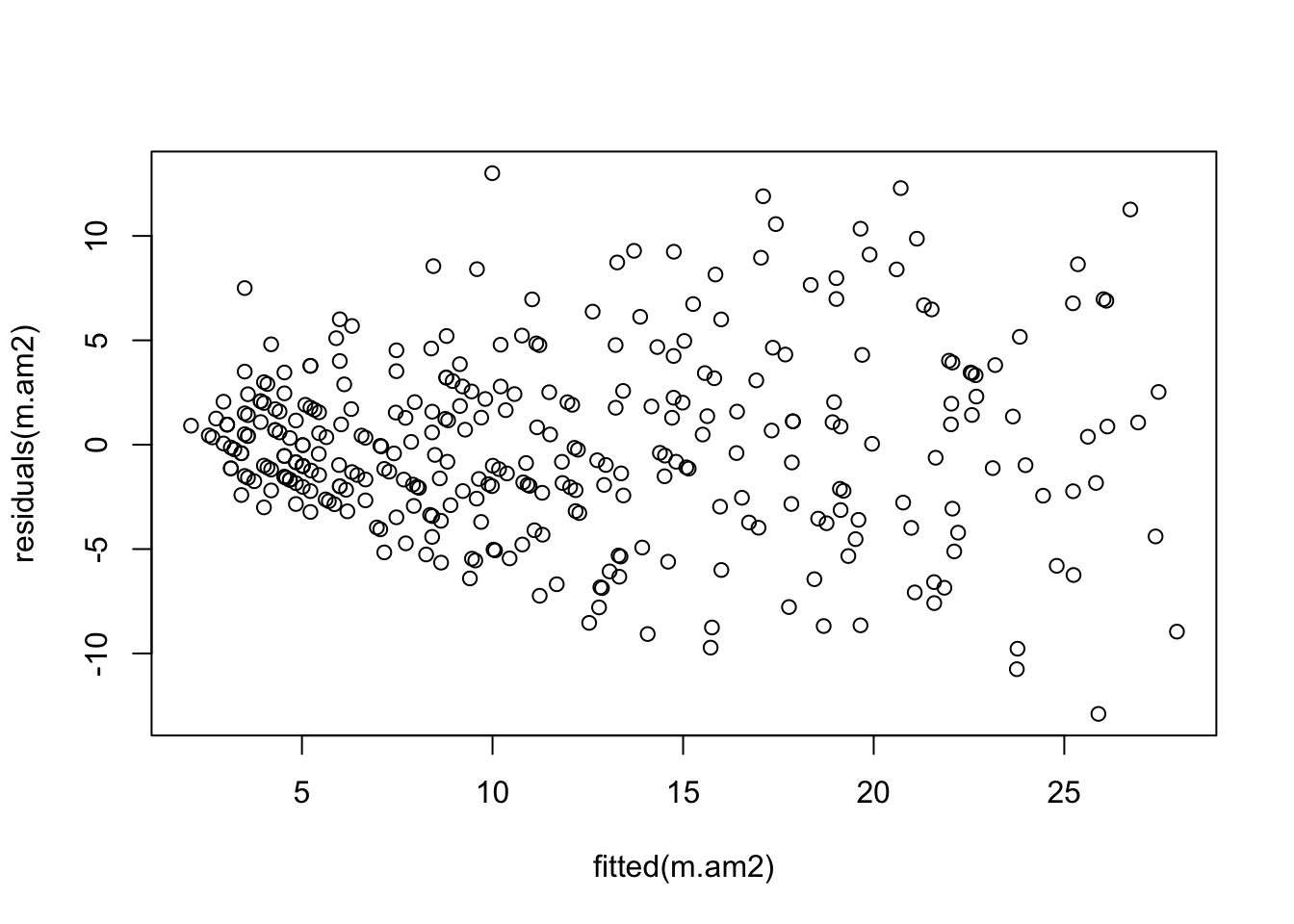 The diagnostic plots for model m.am2 still leave room for improvement.