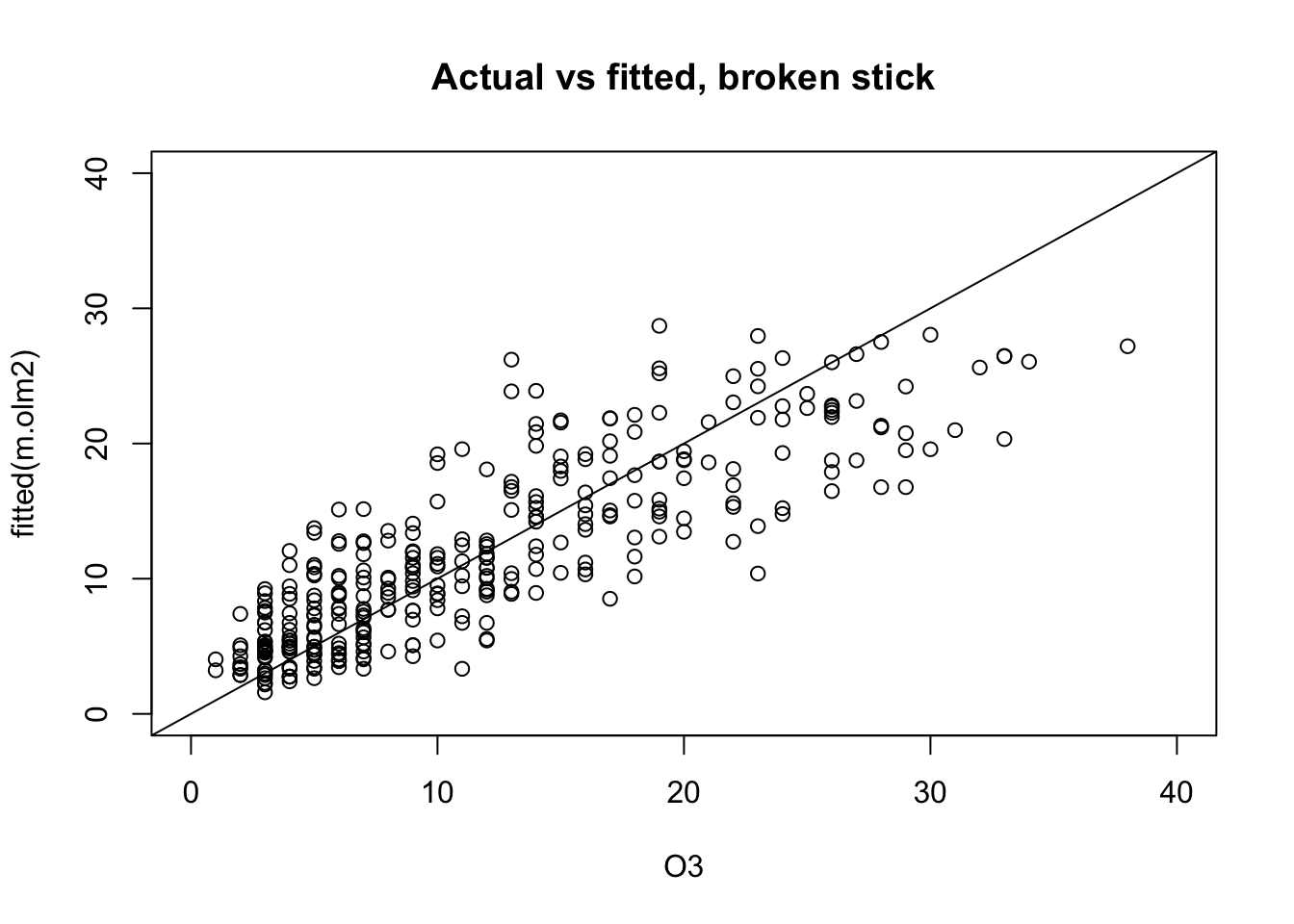 Alternatively, the plots for model m.am hint that both temp and ibh might affect \(O_3\) in a ‘broken stick’ manner. The response of \(O_3\) might be a function of two different straight lines with the break point at \(temp=60\); similarly for ibh with a break point at \(ibh=1000\). We can explore this possibility considering the following linear model.