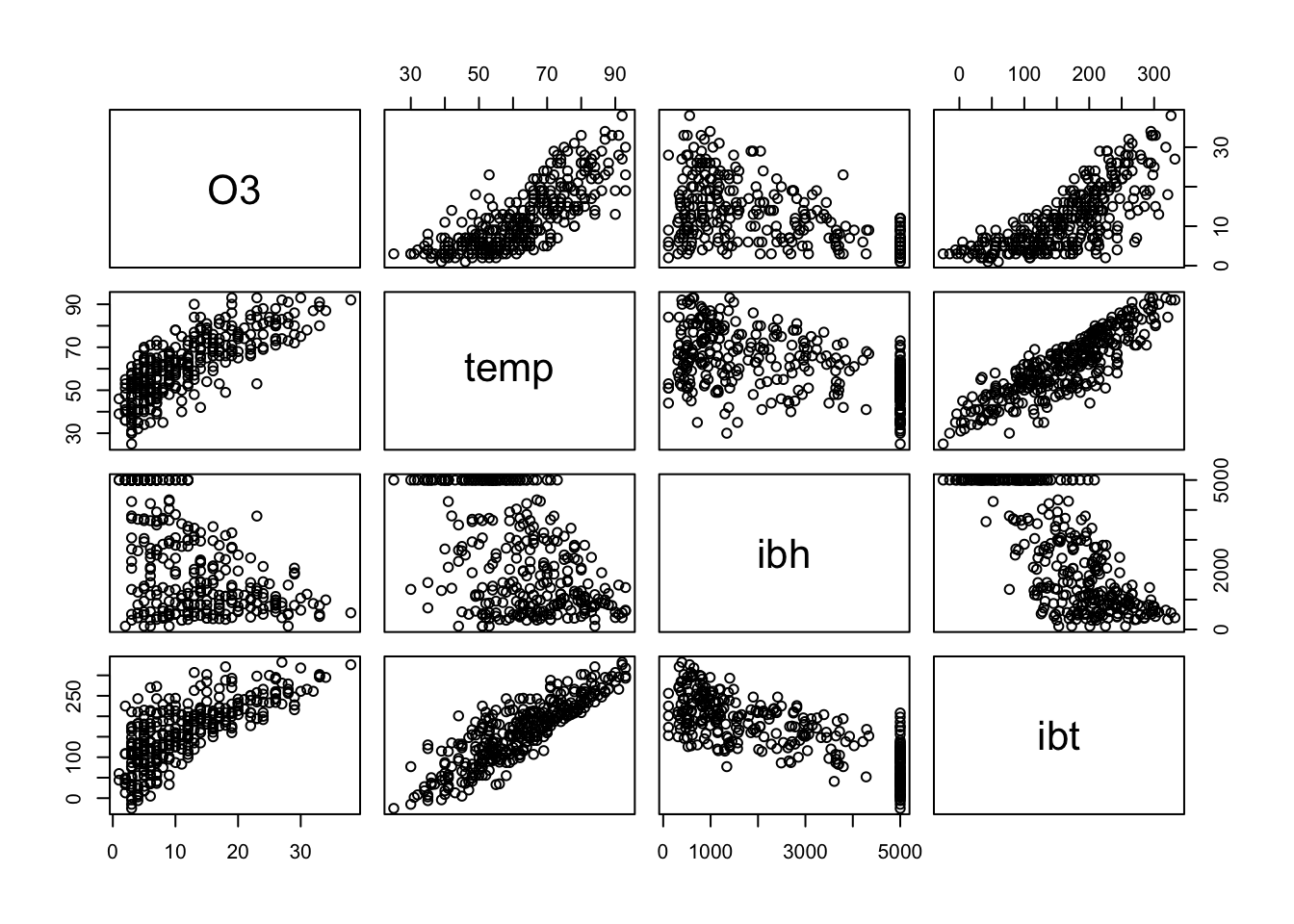 The ozone data are from a study in the Los Angeles Basin in 1976 to examine the relationship between ozone (\(O_3\)) and other meteorological variables. We will use only temperature (temp), inversion base height (ibh) and inversion top temperature (ibt).