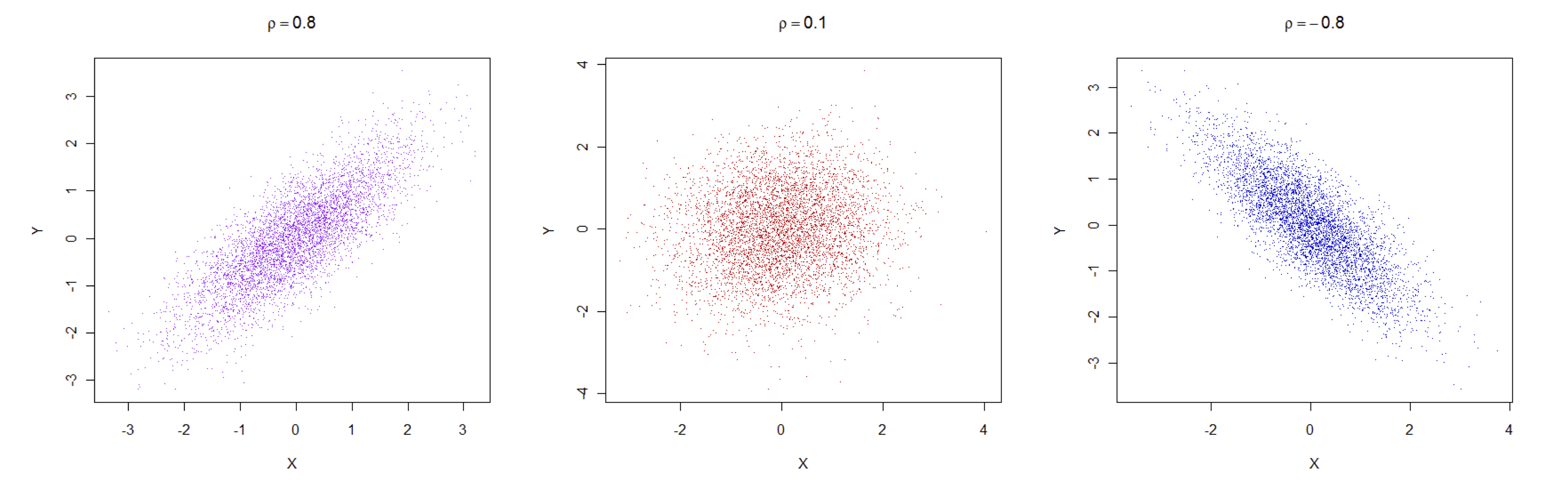Covariances and correlations are closely linked as shown above: \(\rho{ij}=\sigma_{ij}/\sigma_{i}.\sigma_{j}\). In practice, correlations are more interpretable as they are unaffected by rescaling the variables, e.g. from cm. to mm., and the are defined in the interval \([-1,1]\), with \(-1\) meaning perfect negative correlation, \(1\) perfect positive correlation and \(0\) no correlation. The following figure shows exemplary cases of clouds of data points associated with correlations of 0.8, \(0.1\) and \(-0.8\).