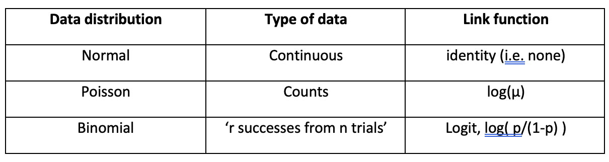 Finally note that we have illustrated the use of GLMs with gaussian, binomial and Poisson data distributions, but other families can be similarly specified though the family argument of the glm function (see ?family).