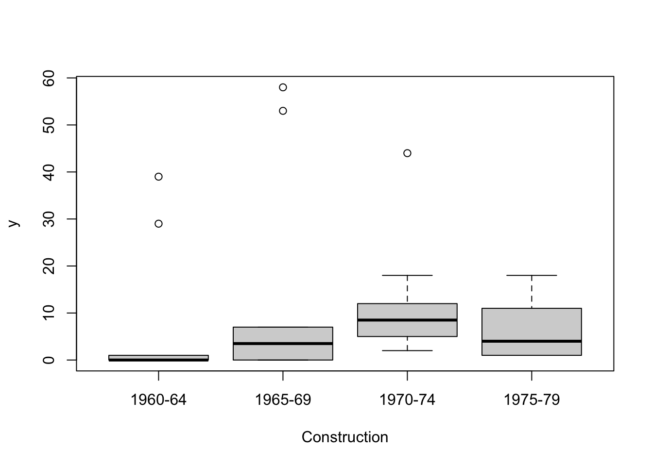 We see that all three factors, Type, Construction and Operation affect Damage. It can happen that the effects of a factor vary according to the levels of another factor (or more generally according to the values of another covariate). This is called an interaction effect and we can include this in the model, for example there is some evidence in the area about a Type by Construction interaction (this is a 2-way interaction). Single 2-way interactions are specified with the : operator in R formulae.