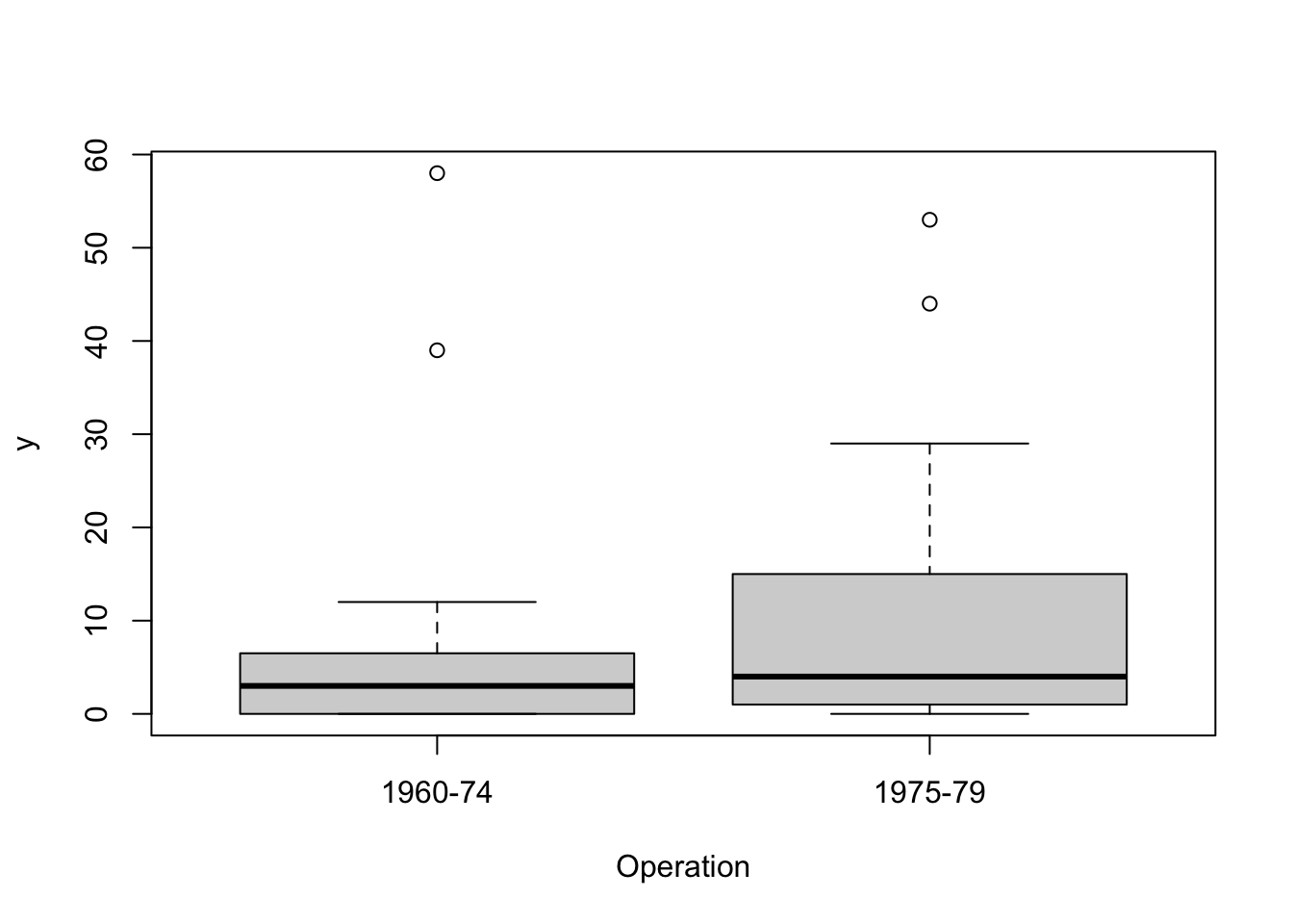 \[\log(\lambda) = mean + Effect(Type) + Effect(Construct) + Effect(Operation)\] However we also have data on how long each ship was in service, in months, and it would seem more sensible to model the mean number of incidents per month, i.e. to model \(\log(\lambda/Service)\). But \(\log(\lambda/Service) = \log\lambda-\log(Service)\). So the model becomes